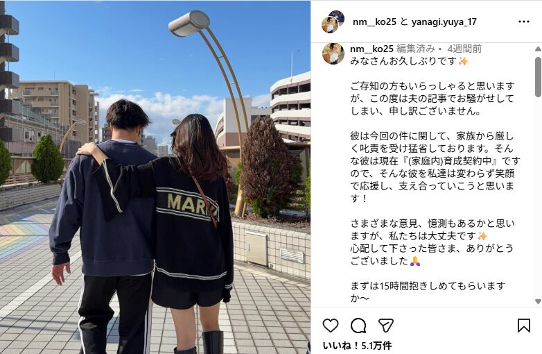 しかし、柳裕也投手の不倫報道を受けてインスタグラムを更新しています。